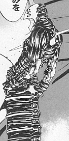 Outfit #3: Here is the freaky spiky outfit Knives wears in Trigun Maximum 2-4. This picture includes the freaky spiky mask. You kind of have to wonder why he would wear something that binds his legs together like that...wouldn't that mean he'd have to hop around like a bunny? Now there's a scary (and hilarious ^_^) thought.