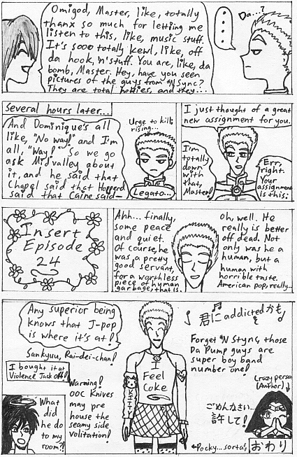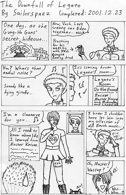 Err, this is really strange ^_^;; One time on the Trigun yaoi mailing list, we got to talking about Legato in a skirt. So, being the weirdo that I am, I decided to draw a picture involving that very subject. However, as I thought about it more, I thought of a way to turn it into a fan-manga. So, here it is ^_^;; This is only the second fan-manga I've done (the other one is on my Dragonball page) and this one is more twisted than the first one ^_^;; I think the way it turned out is best summed up at the very end, where a chibi me is saying, "I'm sorry...Forgive me!" This is the first time I've drawn Legato (though he's so OOC, it really only counts as drawing his hair ^_^) and I manage to defile him in the worst way possible in this fan-manga (and I'm not talking about the skirt...). In the comic, Knives makes two South Park references and a Simpsons one, too...if you can catch both of the South Park ones, you (like me) are seriously obsessed with that show ^_^. Well, I guess I can't put it off any longer...this fan-manga contains extreme Legato OOC-ness, a bit of Knives OOC-ness, and spoilers for events that occur near the end of the series...enjoy ('n' stuff ^_^).