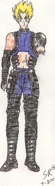 Vash, wearing his super strappy outfit: My god, I picked a fine outfit to draw for my first Trigun fan-art attempt :P I seriously must have picked THE most difficult one...but I had to draw it because it looks so cool ^_^ This took five hours of my life that I'll never get back...but that's OK because it turned out semi-alright ^_^ It's the outfit he's wearing at the end of manga #3. The outfit came out OK, but what I like most is his facial expression. It's so cute ^o^ Drawn July '01