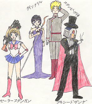 Trigun Sailormoon parody pic: This is the first Sailormoon parody pic I've drawn that doesn't involve men in skirts! *Shock* Oh yes, and for those who can't read Japanese, under Milly it says "Sailor Stungun," under Wolfwood (yes, he's in there ^_^;;) it says "Tuxedo Zange" (zange=confessional), over Meryl it says "Queen Meryl," and over Vash it says "Stampedite." There's a little seiyuu in-joke contained in this picture...do you know what it is? Well, if you don't, I'll tell you ^_^ Vash is dressed up as Jadeite, and Onosaka Masaya plays both of those characters...just a fun little factiod ^_^ Drawn August '01
