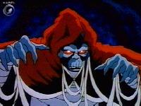 | This is Mumm-Ra, the Ever-Living. He was created by the Spirits of Evil to rule Third Earth. His only goal is to defeat the Thundercats. His home is a black pyrmamid near the Desert of Sinking Sands. As a "mummy" form, as I call it, he can see great distances through his cauldron, cast spells, summon other monsters, and in some cases, transform into other forms. When the Ancient Spirits of Evil turn him into his "warrior" mode, as I call it, he can do much more, like cast stronger spells, fly in mid-air, shrink & grow, and much more. His only weakness for awhile, was when he sees his own reflection, he gets weak. That was no longer the case in later in the show, where his weakness was overcome. Then in the New Thundera series, he gains a evil magic sword, the Sword of Plundarr, a dual-bladed sword from the planet Plundar that indirectly destroyed Thundera and created New Thundera. |
