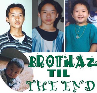 dEz aRe mAh fLy LiL bRoThAz...fRoM bOTtEm lEfT tO rIgHt: pHeNgFeNg (sWeEtEsT LiL bAbEy!), nOuJeNg, cHoUaChEe,N mAh mAd-dOg LiL bRoThA yEeMeNg. ThEzE fOoLz bE sO frEaKiN iRrItAtInG aT tYmEz, bUt i wOuLdNt tRaDe dEm fOe aNytHinG..eSp nOt mAh bAbEy bRoTha cUz hE sUx a SwEeTiE-pIe sUgA-huNniE bUncH-oF-oAtZ hehe =) |