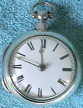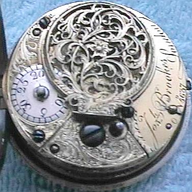 This is a fantastic English sterling silver pair-cased verge fusee in excellent running condition! The hallmarks date it to 1776, making this officially my oldest pocket watch. The watch itself measures about 40 mm in diameter, whereas the outer case measures about 46 mm in diameter. The watch has a gorgeous hand pierced balanced cock, squared "Egyptian" pillars, and a nice hand pierced ornament right near the fusee. The watch has the older "Tompion" style regulator which requires a key to operate. The movement is signed "Jos^h [Joseph] Brookes, London 5637". The dial and the hands are probably NOT original to the watch and may date from as late as 1830-1840.