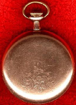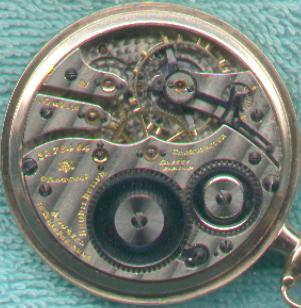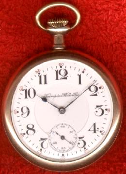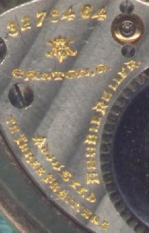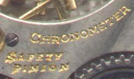 Now, here's where it get's mysterious.... Shugart's "Complete Guide to Watches" lists one 16 size Hampden with the grade name "Chronometer". That particular watch [which just so happens to be a rare, 2-star watch worh as much as $1,000] is listed as having a detent escapement, however, whereas this watch has a standard lever escapement instead. In the back of the listings for size 16 watches, there are a few other possible candidates. There is the "555" grade, which is supposed to be marked "Chronometer" on both the dial and the movement [and is also worth big bucks]. At first, I thought this watch might be a 555 with a replacement dial. But then I heard from a number of watch collectors who said the 555 grade is adjusted to 5 positions, instead of just 3. The next candidate would be the "120" grade. However, that is listed as being marked "Chronometer" on the dial [and presumably not on the movement], whereas this watch is marked on the movement and not the dial! So, this watch is not the "Chronometer" grade, it's not the "555" grade, and I don't believe it is the "120" greade, either. So what grade is it? I really don't know. I do know that it is fantastically accurate whatever grade it might be, and definitely deserves to bear the marking "Chronometer".