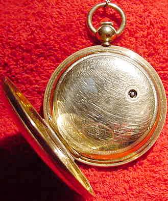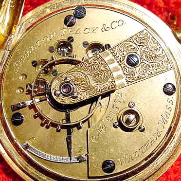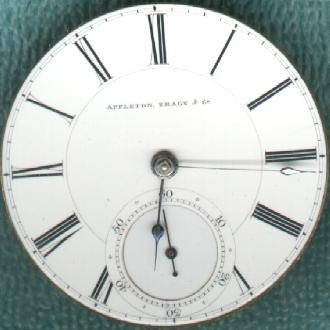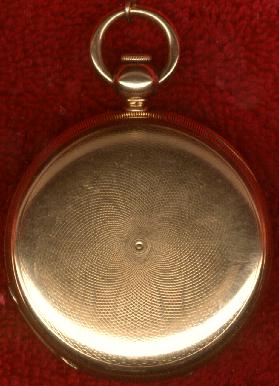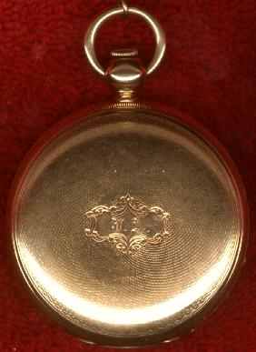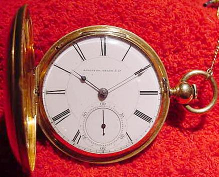 WOW! This is one unbelievably nice watch, if I do say so myself. And I do! This is another very old key wind Waltham pocket watch. It is a 18 size "Appleton, Tracy & Co.", Model 1857. The serial number is only 21772, which dates it to about 1860. It has 15 sapphire jewels and is key wind and key set. The watch is encased in a beautiful and very heavy solid 18 karat gold hunter case with wonderful engine turning on the front and back. The dial is marked "Appleton, Tracy & Co.", and the movement is marked "Appleton, Tracy & Co.", "No. 21772" and "Waltham, Mass".