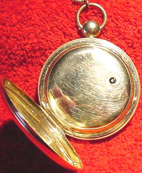 This is a VERY early Waltham pocket watch. Unlike most of my Walthams which have serial numbers well into the millions, the serial number on this watch is only 3,985. which dates it to about 1855 [the company was formed in 1852]. In fact, this watch was actually made when the company was still called the "Boston Watch Company". The watch is an 18 size, Model 1857 and marked "Dennison, Howard & Davis" on the movement. It is key wind and key set, and has 15 sapphire jewels. It is housed in a solid 18-karat gold hunter case which still has some faint engravings left on it.