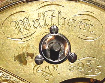The watch movement has a cut, compensated balance which I believe is probably a replacement, since all the early Walthams I have seen had flat steel balances. Compensated balances did exist back then, and were often found on British watches, but I do not think Waltham used them during this time period. The dial, which is completely unmarked, may also be a replacement, since I believe it should be marked "Boston Watch Co."
