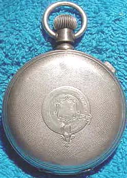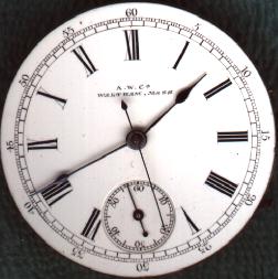 What a watch! This is a very nice [and very hard to find] Waltham chronograph. It is a Size 14, Model 1874 and has 13 jewels. The serial number is 3160627, which dates it to about 1886. It is stem wind and lever set. The chronograph function consists of a center sweep second hand and a button on the side that causes it to start, stop and jump back to zero. The movement is incredibly complex, and what's ESPECIALLY nice about this one is that it is still in its original sterling silver Waltham hunter case.