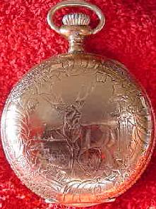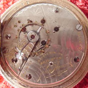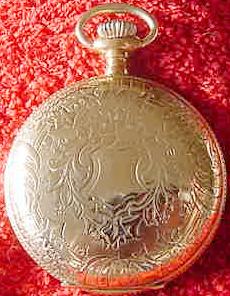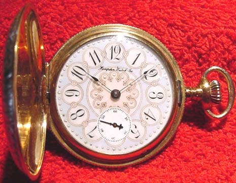 This is a Hampden "John Hancock:" railroad grade pocket watch. It is 18 size, is stem wound and lever set and has 21 jewels. The watch is in a heavy gold filled hunter case with gorgeous engravings on both the front and back.