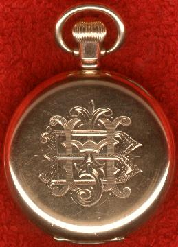 The case, though, is something else! This watch was actually made specifically for the English Export market and it has been housed in a really stunning triple-hinged gold-filled "demi-hunter" case that allows you to tell the time even when the front cover is closed. Not only is the a little window in the front cover and numbers along the edge of the case, the hour hand actually has two spade pointers to indicate the hour whether the cover is open or closed. The inside of the back cover is marked "MOON" and "A.L.D. DENNISON WATCH CASE Co., Ltd." The inside of the dust cover is further marked "ENGLISH MAKE" and "GUARANTEED TO BE MADE OF TWO PLATES OF 10 CT GOLD WITH PLATE OF COMPOSITION BETWEEN AND TO WEAR 20 YEARS." The case also has some of the best engraving I have ever seen on the back of the case, with what looks like the letters "HB" in ornate script.