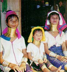 their necks are elongated. On the auspicious day where the first ring is to be put onto the girl, her neck would be massaged and rubbed with ointment for several hours before the ring is put on. It is known that a ring would be fitted every year until the girl is of a marriageable age. It is a tradition for these women to put on rings on both their legs and arms. However, this tradition is slowing disappearing The origin of this tradition is vague. There are a few myths and legends of this tradition. |