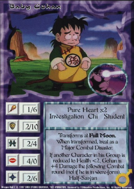 Set: Set 2 - DragonballZ Rarity: Common This little Gohan went to the Market, this Young Gohan stayed home. Oops! Sorry, counting with my toes again. There are a lot of things you can do with Baby Gohan. He's most worth while when one of your characters is gonna die. He has a little "moment" and then starts tearin down your opponent with the power of Piccalo. Another thing that could be used to your advantage is his urge to turn into a big Wolf. Be sure you don't have him around you when Full Moon comes out, but if he's right by your opponent, he might give them a few headaches. The last good thing about him is his charm. He could put on the puppy eyes and go steal the last Dragon Ball. Onto what sucks. 1 power. Ughh. This can be boosted by a variety of cards like Gohan Is Angry and Dodonpa. His Defense also bites a big Namek, but Chi-Chi is a little protective of him, so That won't be a problem. Overall, an ok card woth a few good sides, and stinky stats.