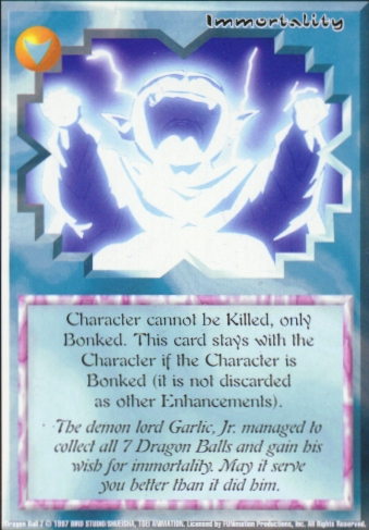Well, at first glance, this card is awesome. Your character won't die! It's great! But then, sometimes it's not so great. Not as in bad, but in not that useful. If you have a Tofu out, this card is Vital. If you want to do that stupid "Piccolo the God" trick, this card is also pretty darn good. But in the average deck, you usually have some 2/2s and some 3/3s. Now it's kinda nice to have them keep coming back, but is it really worth a card slot? I'd much wrather have something like Tsunami or and Extra Who Sows the wind in a small deck. And anyways, Big Characters usually don't get killed, they usually get bonked. It's pretty darn hard to get through their armor and health, and then to get double it is near impossible.
