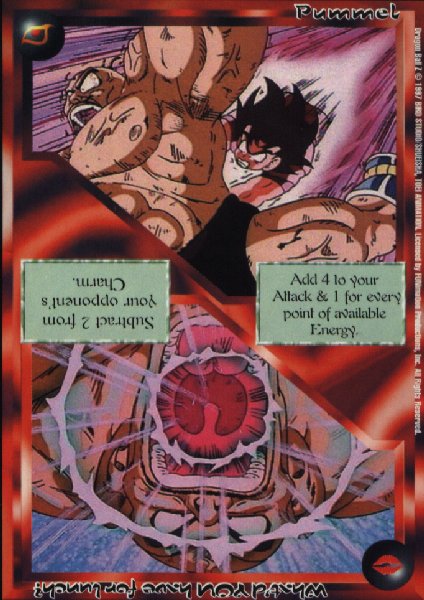 Set: Set 2 - DragonballZ Rarity: Common Wow. Power. This card is full of it. When Set 1 came out, Devastating Attack was pretty darn popular. +4 to your attack could kill almost any opponent. But when this baby hits the table, watch out. In effect with no-energy Characters, it still adds a big 'ol punch to their attack. But with some big Energy people, like Goku, Adult Gohan, Tien, and *shrudder/, Kami and Piccolo, this card is devastaing. Lets see here. With piccolo, that'd be +11, to make him a whoppin 16 power. So a killer card, at least. And then on to the Charm part. Rather bland, but then again, most Combat Cards are. Subtract 2 from Charm. Wow. Boring. Of course, any Combat Card that does something like this to the Power of a Character, has to take away from some aspect. And Charm be it. And that's rather, um, not good. Most DBZ Characters have Charm 2 or less, so it's not going to be a pretty picture when you pull this out. So, overall, A semi-balanced card, and you can never count on it, obviousley, because it's a Combat Card.