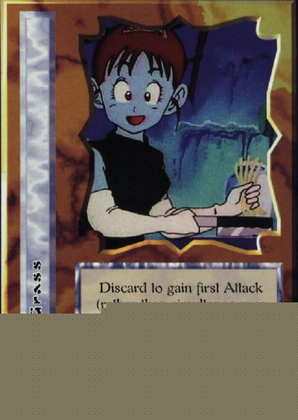 Set: Set 2 - DragonballZ Rarity: Common Wow, I finally got my wish. A Magic-like Ani-Mayhem Card =). This card gives "First Strike" to the Character that forfiets the Item. So, with any sacrafice-item, is it worth it? In some cases, yes. If it would give you the edge in Characters, then it would be very useful. But if your going into a battle that you know it's going to take a few rounds, then this Item is pretty useless. Overall, a mediocre Item, proving deadly in some situations.