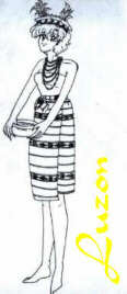 Our last featured outfit is from Mindanao. What Ami is wearing now is from the tribal group of T'Boli (one of the many Filipino ethnic groups still thriving today), famed for their truly captivating T'Nalak cloth made from abaca. Her blouse and skirt are both made from navy blue T'Nalak cloth, and her headdress is made from strings of colorful beads and delicate bronze chimes.