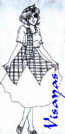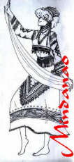kimona made of hand-woven pina cloth from Romblon, and is adorned with the intricate flower embroidery of the Iloilo folk. The dress she is wearing underneath is made of white silk, while her bandanna, tapis and patadyong are made of a plaid yellow and applegreen silk cloth. Her shoes were skillfully carved from wood and is inlaid with pretty shellcraft from Cebu.
