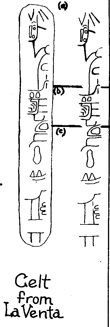 Above is a celt discovered in the 1950's at La Venta offering no. 4. This celt illustrates the similarities between the Olmec and Mande/Vai writing systems. The famous inscribed celts of offering no.4 LaVenta, indicate both the plain and cursive syllabic Olmec scripts .