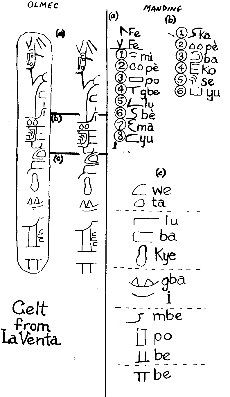 Over a decade ago Winters (1979, 1997) deciphered the Olmec writing and discovered that you could read the Olmec inscriptions using the sound value of the Vai signs. The Olmecs spoke and aspect of the Manding (Malinke-Bambara) language spoken in West Africa (Winters, 1979, 1980, 1981,1984).