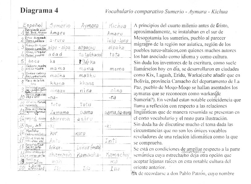 The presence of Sumerian terms in the Aymara language, and Sumerian writing on the Fuente Magna bowl and Pokotia statue make it obvious that Sumerian civilization was formerly widespread in South America.