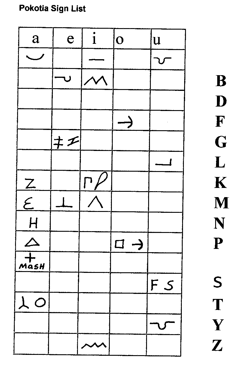 The Pokotia inscriptions are written in the Sumerian language. The signs are related to the Proto-Sumerian writing. The phonetic values for the signs are the phonetic values of similar signs found in the Vai writing. The sounds for the Vai writing were also used to interpret the Olmec writing and Indus Valley writing.