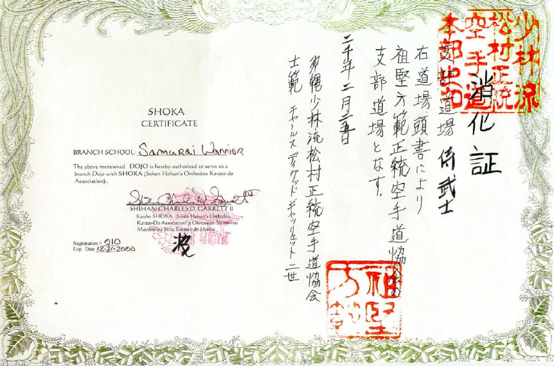 This individual certificate is issued to Mary, one of Shinshii Jesse's Hughes Seito. All seito in SHOKA can have a certificate as this if they like. If your dojo is associated with SHOKA you can get one also. The fee would be $15 per. year. Great to go side by side with promotion certificate. |