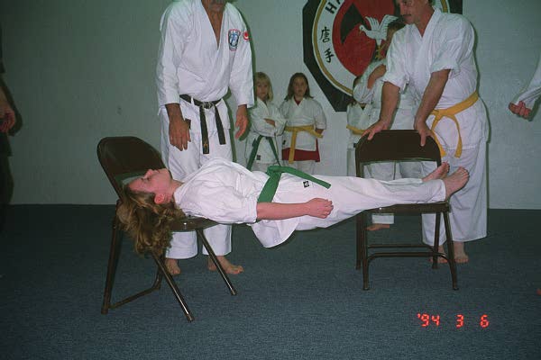 | This is one of several ki concepts displaying the power of thought. The mind has so much energy yet we don't hardly use any at all. This was in Jerry Wilsons Dojo in Illinois. Truly a fine group of karate practictioners without question. His uke for my visit, was like a Die Hard battery, Johnny was his name. He had made one error, and that was to proclaim "Charles threw him harder than anyone else ever had." John should have said included " in such a soft maner." I try to prove at seminars that the hard physical most individuals use only hurts body in long run. Soft ki concepts movements are much better. Could have set two people upon mid section, and she still would be able to maintain streight body alignment, from mentally thinking. Important point in Martial Arts, our mental powers can be greater than our physical. |