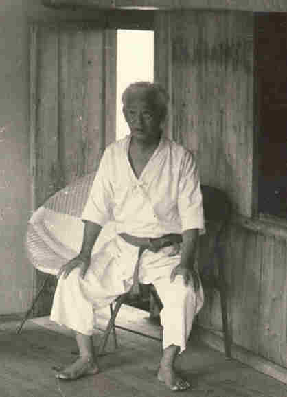 The above photo was almost an every day picture in Hohan Soken's Dojo. The window to his left, was his personnel entrance to dojo. This window sill is also where one day, his crane experience was applied. Hohan Soken loved showing his Seito from Yozadake letters, magazines etc., periodically. Well one day as usual he would step upon sill with his right foot first, he right foot was pretty well planted as it seemed, he steps over with his left foot well into his bedroom. By surpise his right foot slipped into the dojo, and downward, a little. Yet he looked like a High Jumper, while his left foot remained in the bedroom and followedthrough immediately with the right. His Gi did not even touch the window sill that day. What a surpise to these young American G.I.'s. Talking with Melchior Tecson Sempei this past Janurary, he also recalls how we werel amazed of the happenings that day......