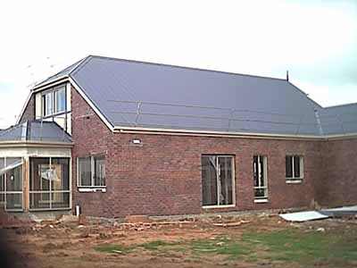 Western view of the house, with brickwork under the windows still unfinished, but a beautiful roof now showing. At some later stage in constuction, the skylight-windows will be put in. There will be two on this side of the roof, one over the stairs and the other in the bathroom.