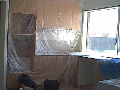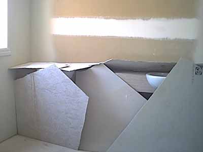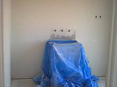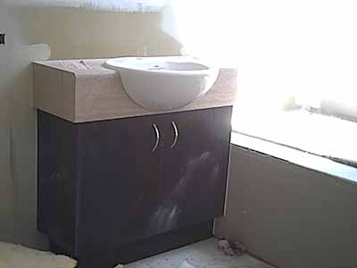 Ensuite double basins precariously protected with plaster board from the paiting and preparation work.