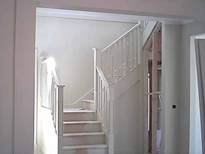 The stairwell that now finally allows us to sticky beak upstairs. The workmen are still doing some last minute plastering up there. Also note to the right of the picture, the alcove where the fridge is supposed to go - this plastering is also unfinished.