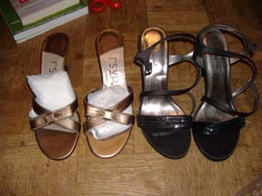 - The shoes on the right is from RSVP. Color is Bronze/Topaz. Size is 6 1/2. The heel is about 2 1/2 inches tall.