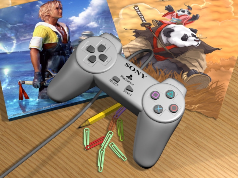 A 3D model of a standard PlayStation gamepad sitting on a tabletop. The original MAX scene file was also lost to the crash.