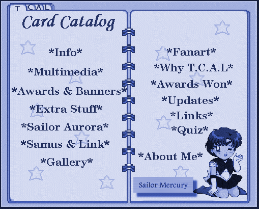 You are now in The Crystal Anime Library. In this internet anime library,you can read info and a fanfic,download some stuff,look at some fanart,get free goodies,and much more. All on Anime! In order to go to these places,click on the links in the card~catalog below. Have fun!