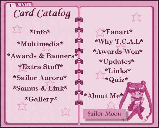 You are now in The Crystal Anime Library. In this internet anime library,you can read info and a fanfic,download some stuff,look at some fanart,get free goodies,and much more. All on Anime! In order to go to these places,click on the links in the card~catalog below. Have fun!