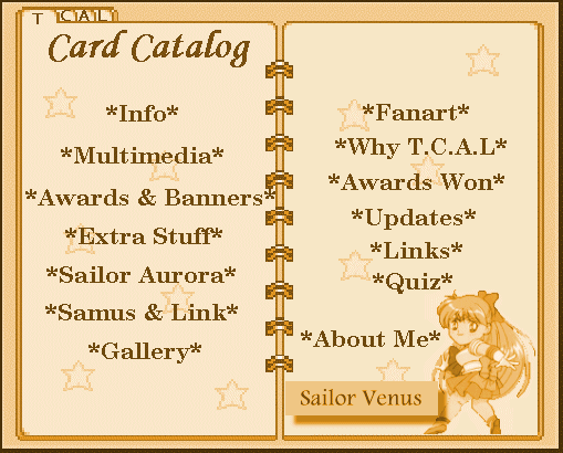 You are now in The Crystal Anime Library. In this internet anime library,you can read info and a fanfic,download some stuff,look at some fanart,get free goodies,and much more. All on Anime! In order to go to these places,click on the links in the card~catalog below. Have fun!