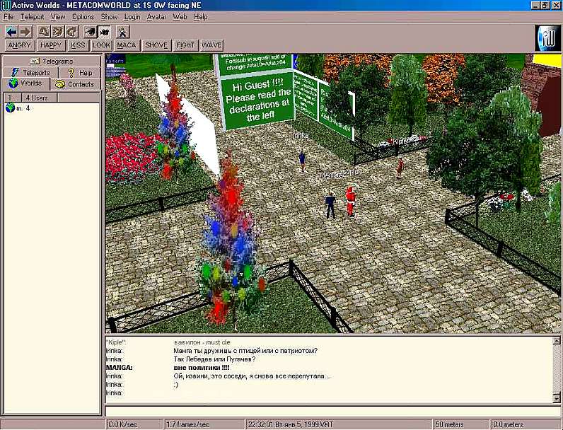 Active Worlds. (AW) To explain more simply, what it is, visualize usual browser, for instance NN or IE, so here is AW - the same browser, only 3D and with the possibility 3D chat.