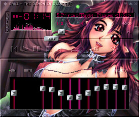 Name of Skin: Saki Shinjo - Death on Heels v2.0 Skinned: eq - pl - mb - avs Rating: ![]() Ewww, she still scares me, I'd even give it a 5 but she forgot the volume and balance, but wouldn't it look funny on it? Only time will tell. |