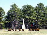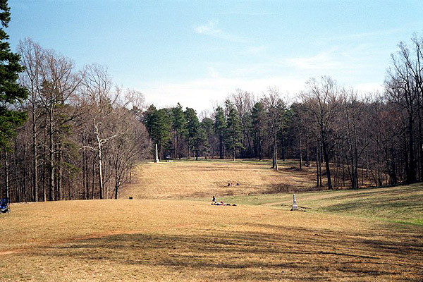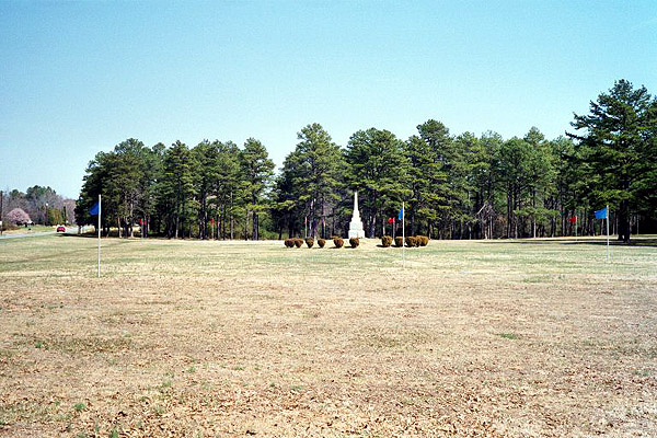 On March 11th, 2001, I was driving back from Raleigh (visiting my sister) when I decided to take a short detour. The first side trip was to the Battle of Alamance near Burlington, which is basically just a field, a granite monument and a small old house nearby. The flag poles represented where the Royal Governor's Milita and the Regulators (rebel farmers) were lined up during their battle on May 16th, 1771. The Regulators were defeated, but still remembered as another important step before the Revolutionary War.