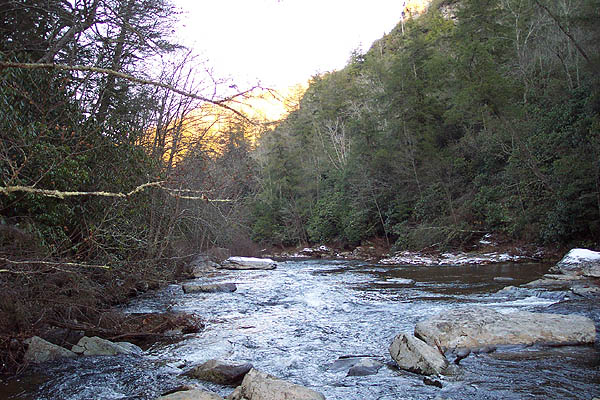 Going down NC 181 and then via NC 183 (this is a good shortcut, don't ever use the BRP if your in a hurry), I arrived in the small community of Linville Falls. Nestled on the county lines of three counties (Avery, McDowell, and Burke), it doens't have much to offer except good Bar-b-que, a 19th Century U.S. Post Office (Still Active), and a waterfall of the same name. Sadly, because I decided to visit the falls so late in the afternoon, I only had enough sunlight left to go on one of the trails to the falls. So I picked a trail I never went on before that would put me in the bottom of the Gorge. This wasn't an easy trail either, as you were either climbing up or down the mountain, not to mention that I was the only person on this trail this late in the day. But I braved it and got some nice pictures of the scenery, and even put my hands in the freezing water (I didn't drink the water though, I have heard that it is somewhat polluted... so sad). Too sum up the rest, I made it back to the visitor center as the sun set.
