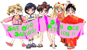 "Ami-Chan no Hatsukoi" "Karei ni henshin? Nakimushi Usagi no Seichoukiroku" "Haruka Michiru Futatabi! Bourei Ningyougeki" "Chibi Usa no Bouken! Kyoufu, Kyuuketsuki no Yakata" and the mysterious episode 89 were not shown yet! SO! Help us to bring them to the german TV! The official German SOS HQ Or help to Save our Sailors in other countries: |
