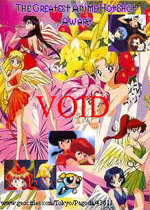 The Greatest Anime Hot Shot Award is for anime pages that rank far above all the rest. They don't just strive for perfection, they are perfection. They are the queen of the crop, and they are hard to follow. The pages that recieve this award are looked up to by all- a terrific example. You must have variety, be organized, and it must look outstanding. If you have an anime page and you think it rocks, then e-mail me. You must have a nice site design, better spelling then mine, good grammer, zero or one link or picture. I mostly look for nice site design and managebility.