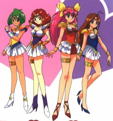 So Aphrodite, the queen of the World of Angels, gave powers to normal junior high school students to fight against the devils. She needed the Saint Something Four to protect her world from the devils. The four girls who transform into the fighters are Momoko Hanasaki, Yuri Tanima, and Hinagiku Tamano,who are first year students at Sei Hanazono Gakuen Junior High School. Scarlet O'Hara is also one, but I know little about her. I do know she does to a diferent scholl then the others and she's probably older. The four girls received items that enabled them to transform into Wedding Peach, Angel Lily, Angel Daisy, and Angel Salvia (who appeared in the later half of the TV series).