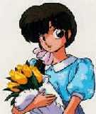 Ukyo Kuonji-Ukenomiaki! However you spell it. I'll fix that later. Ukyo is another fiance to Ranma. When Ranma was little he thought Ukyo was a boy, when, really, Ukyo is a girl cross-dresser. She even went to an all boys school. She's really nice though. Ranma's dad engaged the two, of course. Ukyo is probably Ranma's best friend, and the two get along pretty well. Ukyo calls Ranma Ran-chan, and she's an experet at cooking ukinmiaki. It's like some kind of really good Japanese pizza. She likes to give Ranma free food (along with Shampoo). Ukyo is a very good friend, a mean, even when Akane is down she doesn't mind being nice to her, it just doesn't happen too often. Ukyo isn't a major character, like Ranma, Ryouga, and Akane. She still shows up, but mostly as a side character. In some of the fanfics I've read people get her and Tsubasa together. In others she gets Ranma, Ryouga, or some guy I've never heard of. I think Ukyo should get Ryouga, even though I'd rather have him, because they're good for each other. I'll ellaberate on that some other time.