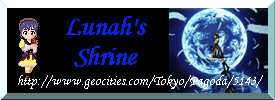 ![]() This page was created on January 16, 1998... Last updated: June 14, 2000 Konnichiwa minna. I'm Lunah (aka. Nocturnal Miyu and many other names that I don't use as often...). If you are wondering who "Lunah" is, well she is a character from the RPG game on Sega CD (I know it's old), "Lunar: The Silver Star." It has nothing to do with Anime, but I think she's pretty cool. Well, my page started out as just an Anime Picture Gallery, but it's grown since then... Well, this page may contain some spoilers, but not much, since I don't know much about some of the Anime myself. :p Oh yeah, my Lunar Page, Vampire Princess Miyu Page, and my Music Gallery are independent of this page, so if you want to know of updates in those pages, you must visit them. You won't find anything out from this page. Other than that, all my updates on my other pages are posted under my updates.