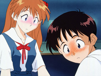 This is from episode 17, 'The 4th Child'. Shinji and Asuka look on in embarrassment as the class laughs due to Touji's accusal of them of being newly-weds. Highlight above