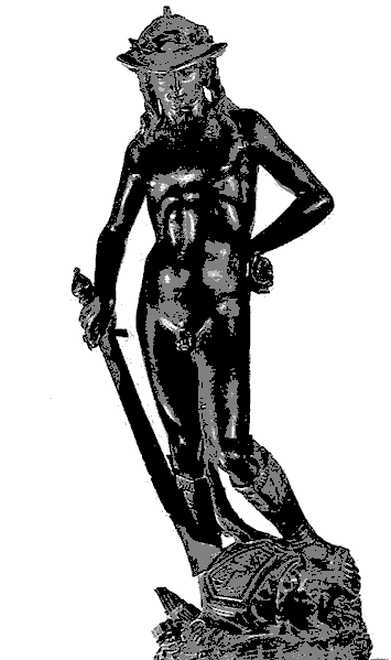 The statue of David, by Donatello, depicts a young David standing nude (it is the first large-scale bronze nude statue in the renaissance) and holding in his hand Goliath's sword, above the head of the dead Giant. As to its dating there is no agreement among the scholars, the most acceptable view suggest the statue to be from the 1440's [1]. It is the same subject as his earlier marble statue of the same scene from 1408-9, however it displays a very different David than the well dressed victorious king. It is also different in the moment depicted because at the marble statue David still holds his slingshot, and hasn't taken up yet the Giant's sword in order to slay him.