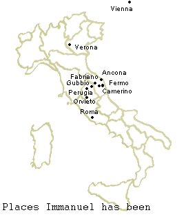 In about 1325, when he was about thirty-five, Immanuel lost al his fortune and had to leave Rome, and wandered in central and north Italy, in Ancona, Perugia, Camerino, cities in which he looked for the assistance of patrons (sarim).